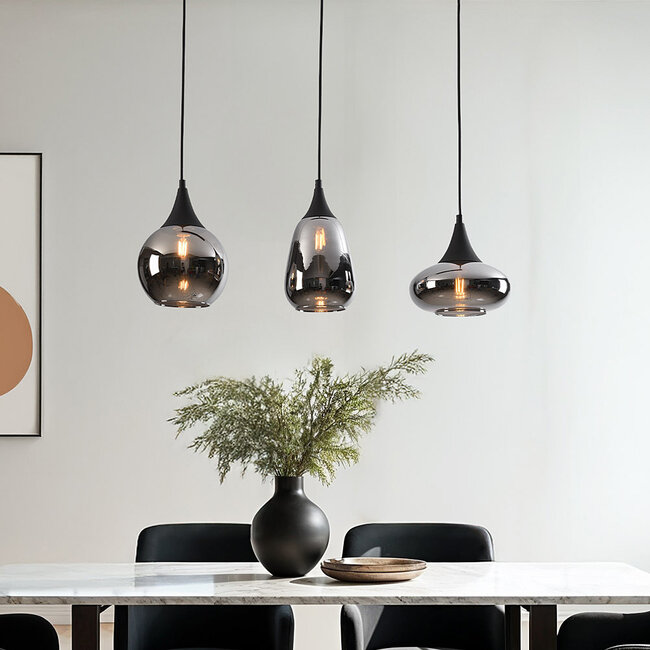 Podstawa lampy wykonana jest z metalu, a kule z przydymionego szarego szkła z efektem lustra. Lampa wisząca ma szerokość 68,8 cm i maksymalną wysokość 150 cm. Płyta sufitowa mierzy 60 x 8,5 cm i ma wysokość 2,5 cm. Przewody do zawieszania można łatwo skrócić, dzięki czemu możesz samodzielnie określić, na jakiej wysokości wiszą kule. Podłużna płyta sufitowa jest wykonana w kolorze czarny mat i idealnie pasuje nad wyspę kuchenną lub długi stół jadalny.