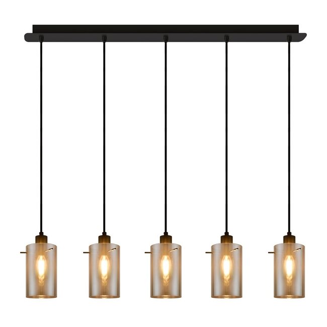 Lampa wisząca Texas posiada pięć cylindrycznych kloszy, które są przymocowane do wąskiego zawieszenia. Szkło kloszy jest dymione szare, co nadaje nowoczesny wygląd. Szkło przyciemnia światło na boki, światło skierowane w dół świeci bez przeszkód. Ta lampa idealnie pasuje nad stół jadalny lub inny stół w Twoim domu.
