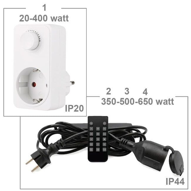 Zestaw ściemniacza do 350 W, 500 W lub 650 W ma stopień ochrony IP44 i jest odpowiedni do użytku zewnętrznego, obsługując maksymalną moc 350 W, 500 W lub 650 W. Zestaw ściemniacza jest dostarczany z pilotem i przewodem zasilającym o długości 3 metrów. W przypadku długotrwałego użytkowania na zewnątrz zalecamy dodatkowe zabezpieczenie połączenia między wtyczką a gniazdem. Można to zrobić, umieszczając połączenie pod zadaszeniem lub upewniając się, że połączenie nie może zbierać i zatrzymywać wody.