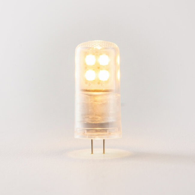 Żarówka G4 to mała lampa wtykowa z dwoma pinami, odpowiednia do kompaktowych opraw oświetleniowych, takich jak reflektory, witryny, kinkiety lub oświetlenie dekoracyjne. Ta ściemnialna lampa LED G4 o mocy 2,1W zastępuje tradycyjne żarówki halogenowe i oferuje ciepłą barwę światła 2700K oraz strumień świetlny 210 lumenów. Dzięki długiej żywotności i niskiemu zużyciu energii, ta żarówka łączy nastrojowe światło z wydajnością – idealna dla tych, którzy szukają stylu i trwałości.