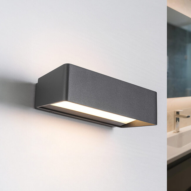 Szukasz lampy łazienkowej, która zapewni jasne i praktyczne światło? Raf to właściwy wybór. Szeroki, prostokątny design emituje przyjemne, rozproszone światło zarówno w górę, jak i w dół – idealne do umieszczenia obok lub nad lustrem. Minimalistyczne wykończenie z ciemnoszarego aluminium nadaje lampie stylowy i ponadczasowy wygląd. Dzięki stopniowi ochrony IP65 lampa jest odporna na wodę i odpowiednia do wilgotnych pomieszczeń.