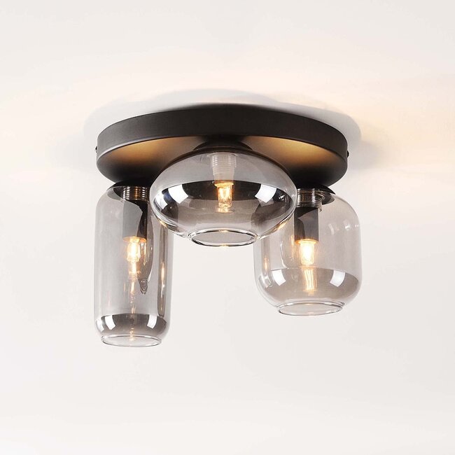 Lampa sufitowa Penba od razu przyciąga uwagę swoją nowoczesną czarną podstawą i trzema stylowymi kloszami z przydymionego szkła, które razem tworzą ciepły i nastrojowy efekt świetlny. Dzięki kompaktowej konstrukcji lampa ta doskonale sprawdzi się w salonie, przedpokoju lub sypialni. Lampa wyposażona jest w trzy gniazdka G9 (źródła światła nie są dołączone), dzięki czemu możesz samodzielnie wybrać pożądane źródła światła – idealne dla tych, którzy cenią styl i elastyczność.