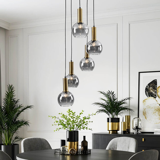 Ta elegancka lampa wisząca z pewnością odświeży Twoje wnętrze. Pięć kloszy ze szkła dymionego jest regulowanych i zamocowanych na płycie sufitowej w sposób stopniowy. Tworzy to zabawny i dynamiczny efekt. Zawieś Imme stylowo nad okrągłym stołem jadalnym lub jako element przyciągający wzrok w salonie.