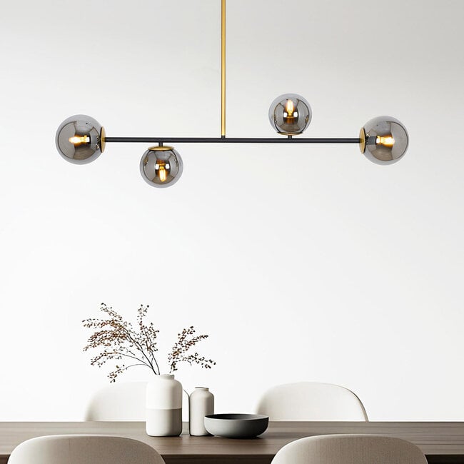 Lampa sufitowa o ponadczasowym designie, pasująca do każdego wnętrza. To jest Davy. Lampa ma piękny, smukły design z czterema fantazyjnie rozmieszczonymi kulami o różnych rozmiarach. Połączenie stalowej oprawy i szklanych kul wprowadza spokój do Twojej przestrzeni, a jednocześnie sprawia, że ta lampa wisząca jest prawdziwym elementem przyciągającym wzrok.