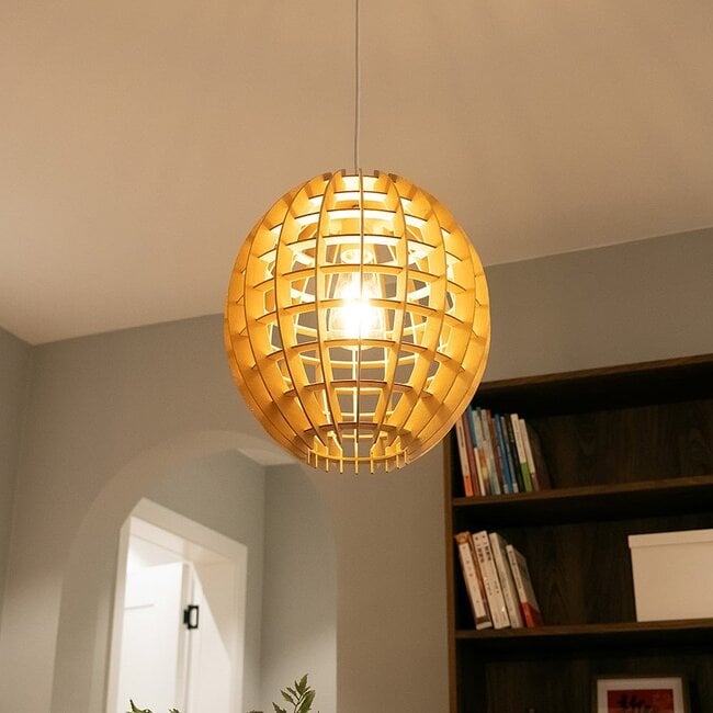 Trae to wyjątkowa lampa wisząca, która przypomina globus. Trae jest wykonana z drewna i zapewnia kojący design we wnętrzu. Drewniane paski, które krzyżują się ze sobą, tworzą zabawne wzory świetlne na ścianie i suficie.