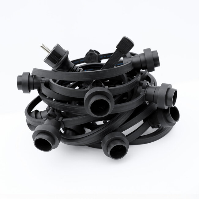 Girlanda świetlna o długości 25 metrów doskonale nadaje się do stworzenia nastroju w ogrodzie, na imprezie (firmowej) lub w lokalu gastronomicznym. Piękno girlandy świetlnej z gniazdkami E27 polega na tym, że produkt ten właściwie nie zmienił się na przestrzeni czasu. Wytrzymałe kable wykonane są z wysokiej jakości gumy z miedzianym okablowaniem 2x1,5mm². Kable nadają się do długotrwałego użytku zewnętrznego. Jeśli zamówisz standardową girlandę świetlną, zostanie ona dostarczona z wtyczką, zamontowanymi gniazdkami z pierścieniami uszczelniającymi i zaślepką. Jedyne, co musisz zrobić po otrzymaniu produktów, to wkręcić żarówki (do zamówienia osobno) w gniazdka, aby następnie cieszyć się nastrojowym oświetleniem. Ta girlanda świetlna doskonale nadaje się również w połączeniu z naszymi białymi lampionami zewnętrznymi.