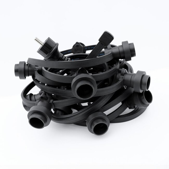 Girlanda świetlna o długości 35 metrów doskonale nadaje się do stworzenia nastrojowej atmosfery w ogrodzie, na imprezie (firmowej) lub w lokalu gastronomicznym. Piękno girlandy świetlnej z gniazdkami E27 polega na tym, że produkt ten w zasadzie nie zmienił się na przestrzeni czasu. Wytrzymałe kable wykonane są z wysokiej jakości gumy z miedzianym okablowaniem 2x1,5mm². Kable nadają się do długotrwałego użytku zewnętrznego. Jeśli zamówisz standardową girlandę świetlną, zostanie ona dostarczona z wtyczką, zamontowanymi oprawkami lamp z pierścieniami uszczelniającymi i zaślepką. Jedyne, co musisz zrobić po otrzymaniu produktów, to wkręcić żarówki (do zamówienia osobno) w oprawki, aby cieszyć się nastrojowym oświetleniem. Ta girlanda świetlna doskonale nadaje się również w połączeniu z naszymi białymi lampionami zewnętrznymi.