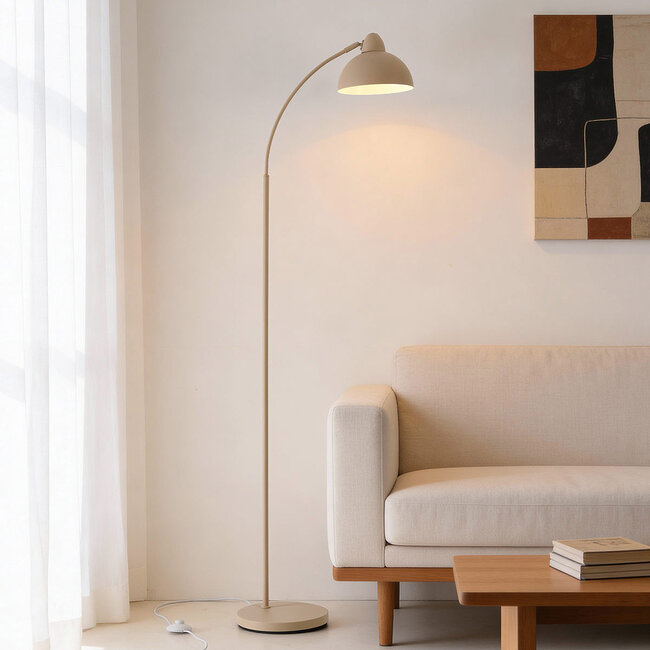 Lampa podłogowa Arc to elegancka lampa łukowa o smukłym, nowoczesnym designie. Beżowe metalowe wykończenie i subtelnie wygięte ramię nadają lampie spokojny i ponadczasowy wygląd. Klosz jest od wewnątrz wykończony na biało, co zapewnia przyjemne i ukierunkowane rozprowadzenie światła.