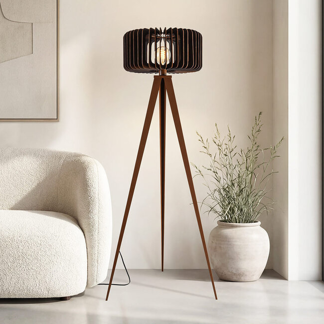 Lampa podłogowa Oakly to charakterystyczna lampa designerska, która dodaje ciepła i atmosfery do wnętrza. Otwarty klosz z pionowymi drewnianymi lamelami tworzy piękną grę światła i cienia, a wygląd orzecha włoskiego zapewnia bogaty, naturalny wygląd. Smukła metalowa podstawa trójnogu nadaje lampie lekki i nowoczesny wygląd. Lampa jest wyposażona w gniazdko E27 (źródło światła nie jest dołączone), dzięki czemu możesz samodzielnie wybrać źródło światła, które pasuje do pożądanej atmosfery. Oakly pięknie prezentuje się jako element tworzący nastrój w salonie, obok fotela lub jako akcent dekoracyjny w nowoczesnym lub skandynawskim wnętrzu.