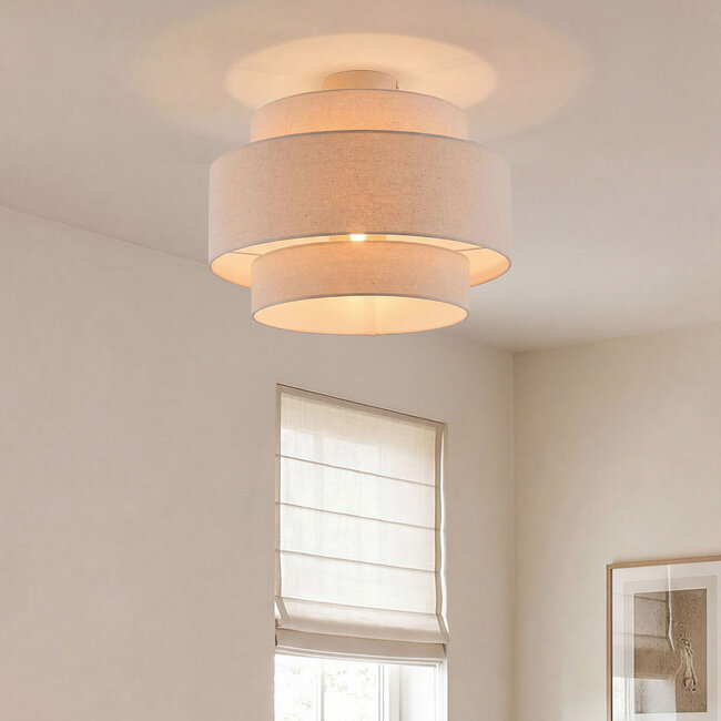 Lampa sufitowa Corre wyróżnia się warstwowym designem z trzema lnianymi kloszami. Światło delikatnie przenika między warstwami, tworząc ciepły i rozproszony efekt świetlny w pomieszczeniu. Beżowy kolor i naturalna struktura lnu nadają lampie spokojny i nastrojowy wygląd. Dzięki kompaktowemu montażowi blisko sufitu, Corre nadaje się na przykład do salonu, sypialni lub przedpokoju. Lampa jest wyposażona w gniazdko E27 (źródło światła nie jest dołączone), dzięki czemu możesz samodzielnie wybrać pożądany kolor i natężenie światła.