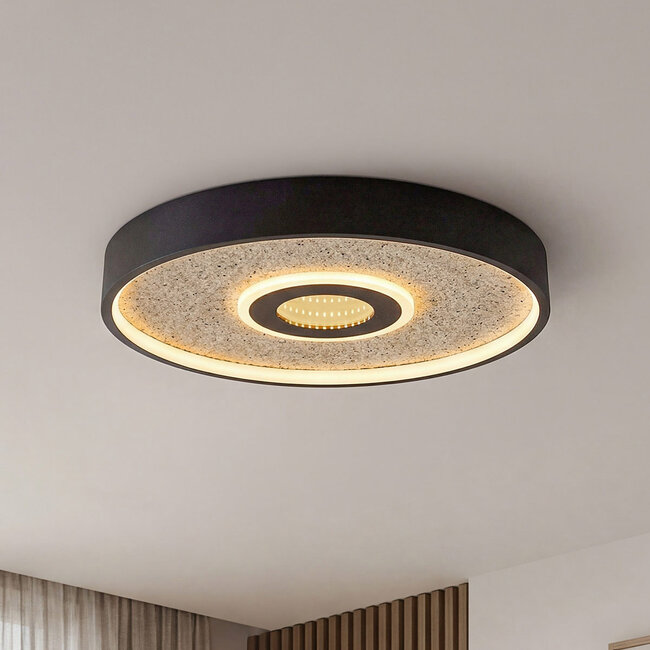 Lampa sufitowa Deimos ma elegancki okrągły design i nadaje się jako oświetlenie podstawowe w przedpokoju, sypialni lub salonie. Czarna krawędź otacza beżową powierzchnię z delikatną, kamienną strukturą, co nadaje jej spokojny i naturalny wygląd.
