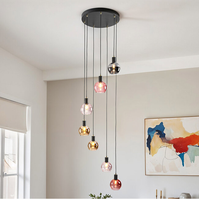 Z odrobiną koloru nadasz swojemu pokojowi zupełnie nowy wygląd. Siedem zabawnych i kolorowych kloszy ze szkła dymionego, bursztynowego i różowego rozprasza równomierne, miękkie światło. Niezależnie od tego, czy szukasz przytulnego wieczoru z przyjaciółmi, czy romantycznego oświetlenia nastrojowego, ta lampa wisząca stworzy idealną atmosferę.