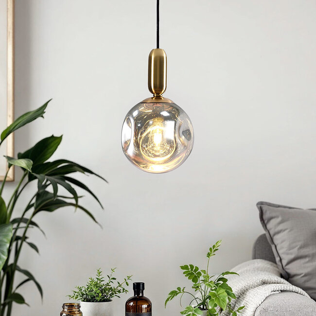 Lampa wisząca Lewis to prawdziwa ozdoba każdego wnętrza. Artystyczny design szklanej kuli jest nie tylko unikalny wizualnie, ale także wpływa na rozpraszanie światła. Faliste szkło sprawia, że światło jest rozpraszane po pomieszczeniu w zabawny sposób. Możesz wybrać szkło w kolorze chromu, złota lub różowego złota. Każdy wariant zapewnia nastrojowy wygląd, wybierz kolor, który najlepiej pasuje do Twojego wystroju i stwórz spójną całość. Dzięki swoim wąskim wymiarom Lewis nadaje się do sypialni nad szafkami nocnymi lub do salonu nad stolikiem bocznym lub stolikiem kawowym.