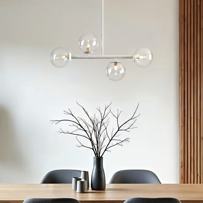 Asun ma długość 60 centymetrów i maksymalną wysokość 101,5 centymetra. Lampa ma regulowaną wysokość. Lampa posiada cztery szklane kule z gniazdkiem G9 o maksymalnej mocy 40 W na gniazdko. Źródła światła nie są dołączone. Dzięki temu możesz samodzielnie zdecydować, jakich źródeł światła użyjesz. W zależności od wybranego źródła światła, lampa wisząca jest ściemnialna za pomocą zewnętrznego ściemniacza (brak w zestawie). Szukasz ściemniacza? Zapoznaj się z naszymi ściemniaczami ściennymi.