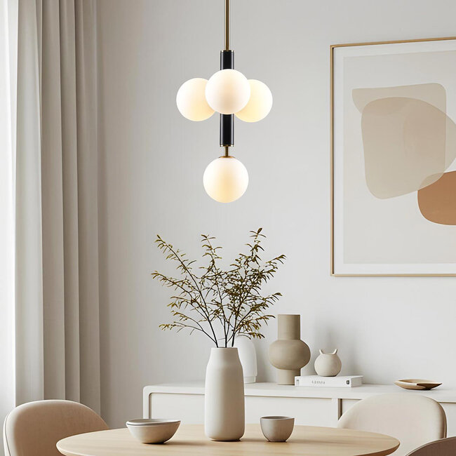 Szukasz wyjątkowej lampy wiszącej nad mały lub średni stół? Lennard to doskonała opcja. Ta lampa wisząca ma cztery mlecznobiałe szklane kule, które zabawnie wiszą wokół eleganckiego czarnego drążka. Dzięki temu Lennard doskonale pasuje do nowoczesnego wnętrza. Piękne połączenie światła i formy natychmiast przyciąga uwagę. Dzięki mlecznobiałemu szkłu światło jest delikatnie rozpraszane po pomieszczeniu. Ta nastrojowa lampa jest prawdziwym dodatkiem do Twojej jadalni lub salonu.