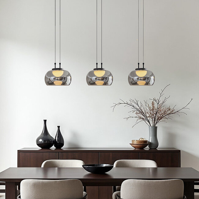 Chcesz stworzyć piękną atmosferę dzięki tej czarnej lampie wiszącej? Z Gujo jest to możliwe. Ta lampa wisząca składa się z czarnej oprawy, trzech przydymionych szklanych kul i zintegrowanych diod LED w ciepłej białej barwie światła (2700K). Podłużna rama doskonale nadaje się do zawieszenia nad długim stołem jadalnianym lub wyspą kuchenną. Dzięki wbudowanej funkcji 3-stopniowego ściemniania możesz ściemniać lampę wiszącą według uznania i nadać każdej okazji piękną atmosferę.