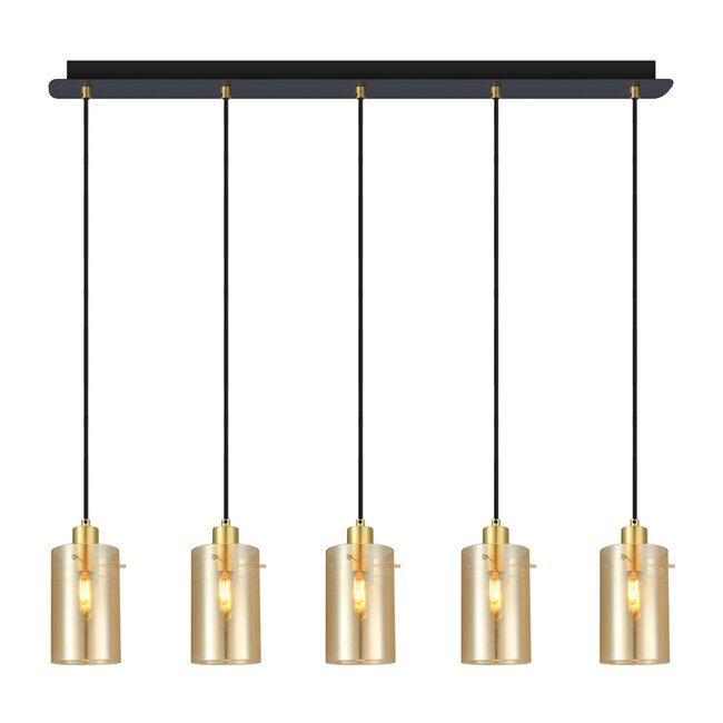 Lampa wisząca Seattle posiada pięć cylindrycznych kloszy, które są zamocowane na wąskim zawieszeniu. Szkło kloszy jest w kolorze bursztynowym, co nadaje ciepły, nowoczesny wygląd. Piaskowe złoto dodaje jej dodatkowego uroku. Szkło pięknie rozprasza światło na boki, a światło skierowane w dół świeci bez przeszkód. Ta lampa idealnie pasuje nad stół jadalny lub inny stół w Twoim domu.