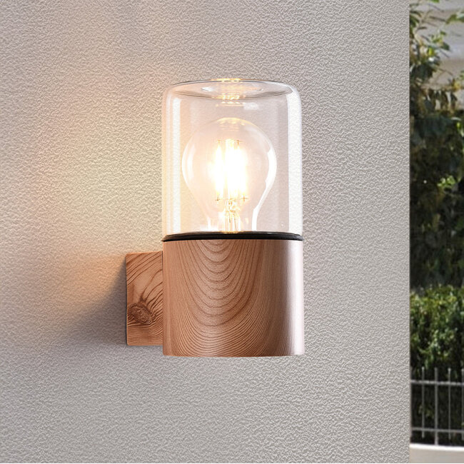 Czy w Twojej przestrzeni zewnętrznej brakuje eleganckiej kinkiety? Dzięki kinkietowi zewnętrznemu Juliano możesz w minimalistyczny sposób ozdobić swoje ściany zewnętrzne. Szklany klosz i podstawa w kolorze ciemnego drewna zapewniają nowoczesny wygląd o prostym designie. Dzięki przezroczystemu kloszowi kinkiet można pięknie połączyć z dekoracyjną żarówką LED z żarnikiem (nie wchodzi w skład zestawu). Chcesz uzyskać ciepłe, powitalne światło? Wybierz żarówkę z szkłem bursztynowym i nadaj lampie swój własny styl.