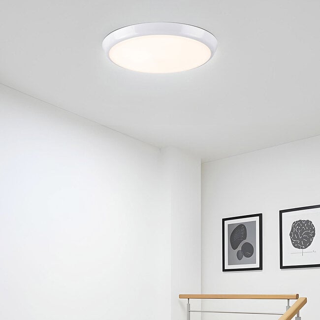 Nowoczesny design tej białej oprawy sufitowej sprawia, że lampa doskonale pasuje do niemal każdego pomieszczenia. Wyposażona w solidną białą osłonę z poliwęglanu, lampa ta jest idealna do stosowania w holach i korytarzach wewnątrz budynku. Z natężeniem światła 10, 12 lub 15 watów i strumieniem światła do 1500 lumenów, lampa zapewnia wystarczające oświetlenie dla większych pomieszczeń. Aby jasno oświetlić długi korytarz lub duże pomieszczenie, można umieścić kilka opraw sufitowych jedna za drugą. Oprawa sufitowa ma średnicę 25,5 cm i wysokość 4,8 cm.