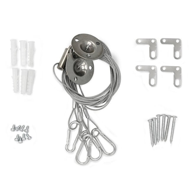Dzięki temu zestawowi do zawieszania możesz podwiesić lub zawiesić panele LED z naszej oferty. Zestaw do zawieszania składa się m.in. z dwóch regulowanych stalowych linek o długości 1,5 metra, z zaczepami na końcach, które mocuje się w uchwytach na panelu LED. Uchwyty można przykręcić do panelu LED za pomocą dołączonych śrub. Ten zestaw jest dostarczany w komplecie z uchwytami, śrubami i kołkami nylonowymi. Zobacz instrukcję, aby uzyskać więcej informacji.