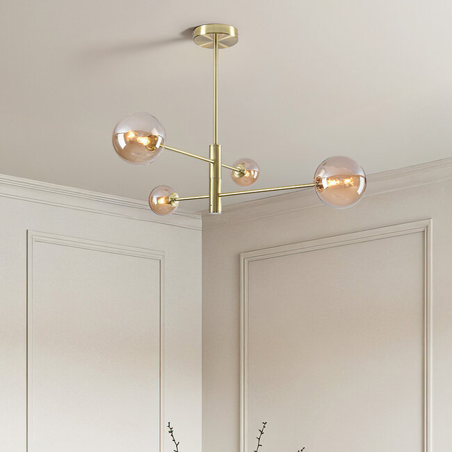 Szukasz zabawnej lampy sufitowej? Stiri to odpowiedni wybór. Dzięki minimalistycznej oprawie oświetleniowej i czterem bursztynowym szklanym kulom, Stiri emanuje luksusem. Cztery kule są zabawnie przymocowane do oprawy oświetleniowej. Kule mają dwa różne rozmiary, a bursztynowe szkło zapewnia miękkie światło i tworzy przyjemną atmosferę. Minimalistyczna lampa, która doda blasku Twojej sypialni, salonowi lub przedpokojowi.